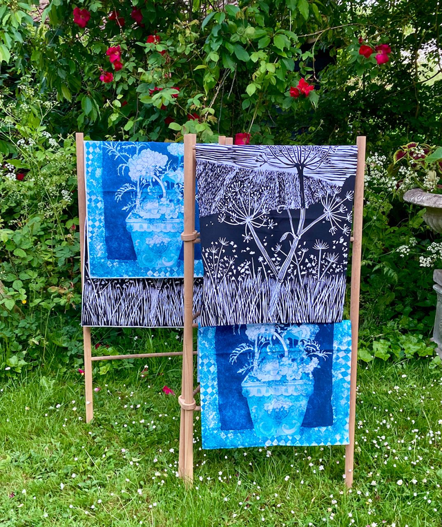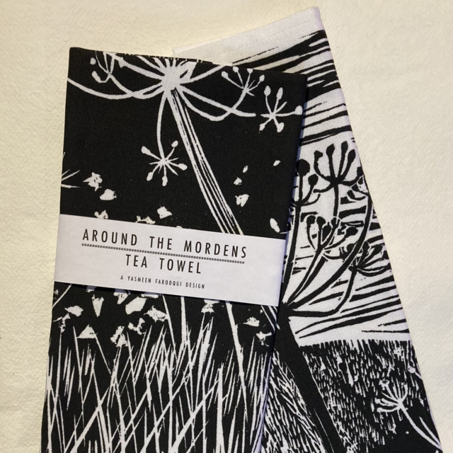 Tea towel with black and white design of cow parsley and fields. The image is taken from a woodcut print. Cotton,Machine washable at 30 degrees.